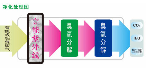 UV光解利用特制的高能高臭氧UV紫外线光束照射恶臭气体,改变恶臭气体的分子链结构,使有机或无机高分子恶臭化合物分子链,在高能紫外线光束照射下,降解转变成低分子化合物,如CO2、H2O等
