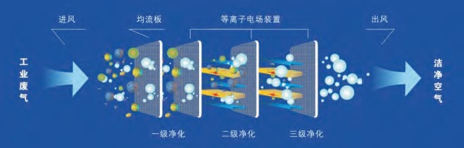 低温等离子是由电子、离子、原子和自由基础的混合体。 异味从低温等离子设备进入。有机废气进行处理。在高能电子的作用下,臭气分子被活性氧等强氧化性物质强行分解,组合成其他分子。从而促进异味消除,净化后气体排出。